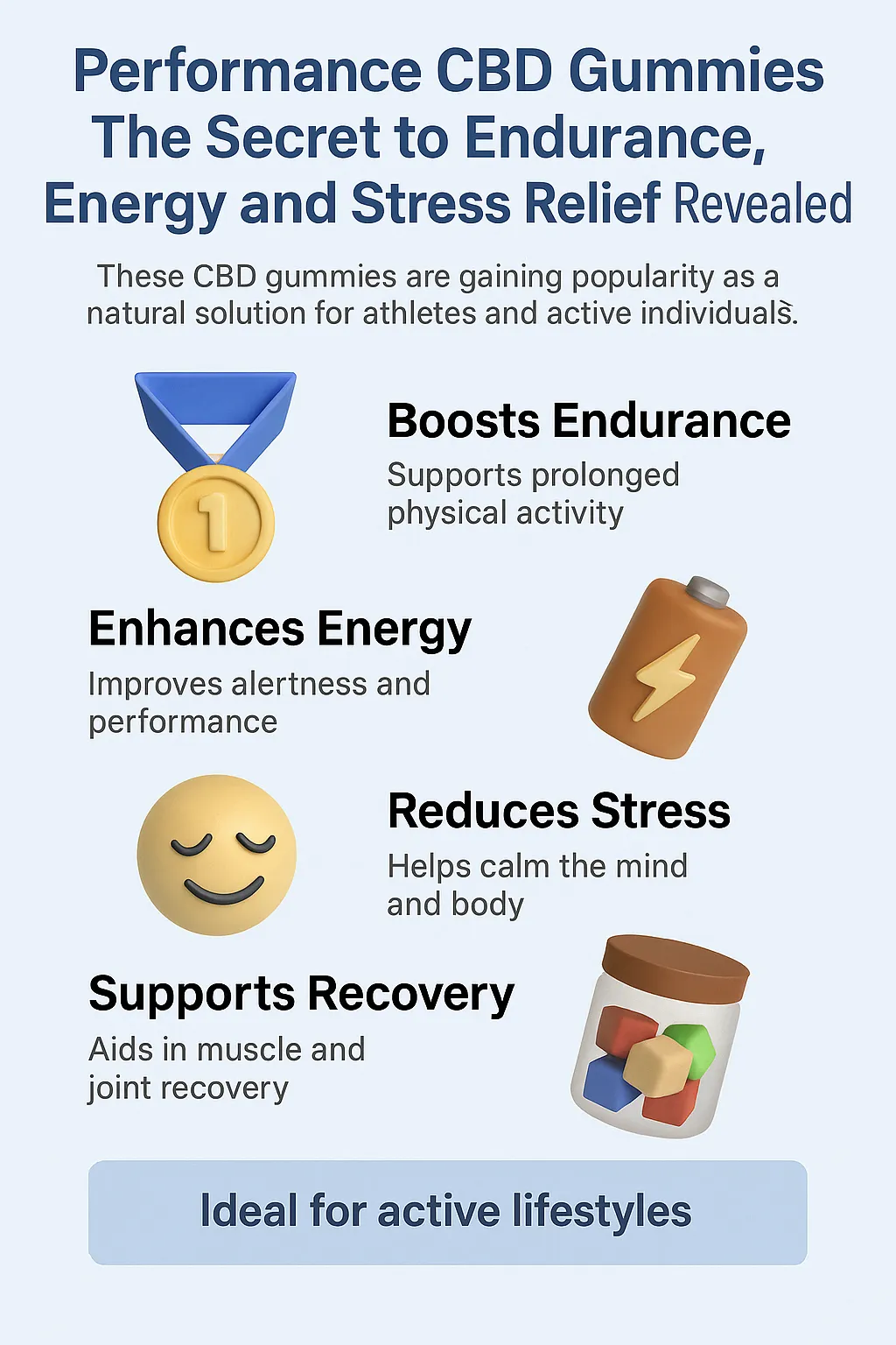 - CBD gummies are popular for endurance, energy, and stress relief.