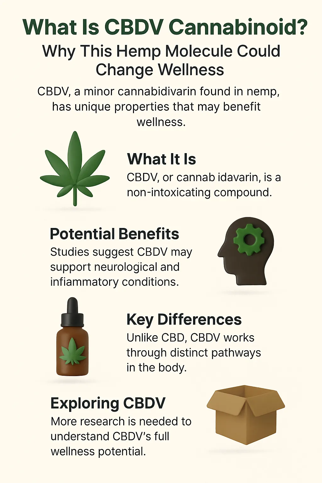 What is CBDV cannabinoid, and why are researchers calling it one of the most promising hemp discoveries? CBDV—short for cannabidivarin—is a rare, non-intoxicating compound found in select hemp and cannabis strains. Unlike CBD, which is widely known for relaxation and anti-inflammatory benefits, CBDV interacts differently with the body’s endocannabinoid system, making it uniquely valuable in wellness research.