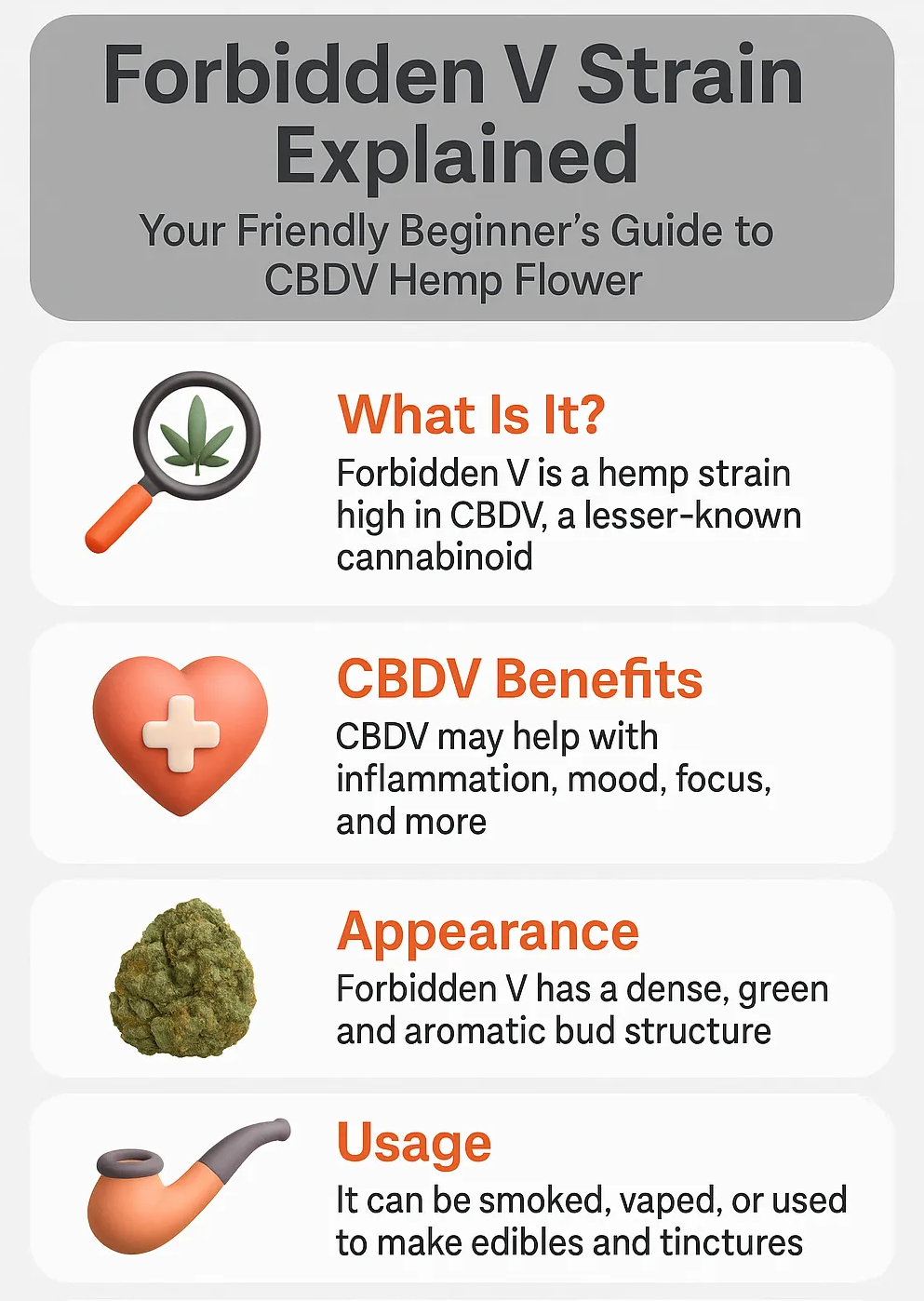 The Forbidden V strain stands out as a rare CBDV-rich hemp flower that redefines what users expect from modern cannabinoids. Unlike conventional CBD strains known for deep relaxation, Forbidden V delivers a distinctive blend of calm focus and mental clarity — an uncommon experience even among premium cultivars. Cultivated from a carefully bred lineage designed to elevate CBDV content, this strain reflects the next evolution of hemp genetics. Its earthy-sweet aroma, energizing balance, and clean finish make it an ideal choice for those seeking clarity without sedation. This beginner’s guide explores what truly sets Forbidden V apart, offering insights into its cannabinoid composition, unique effects, and why it’s fast becoming a favorite among wellness enthusiasts and hemp connoisseurs alike.
